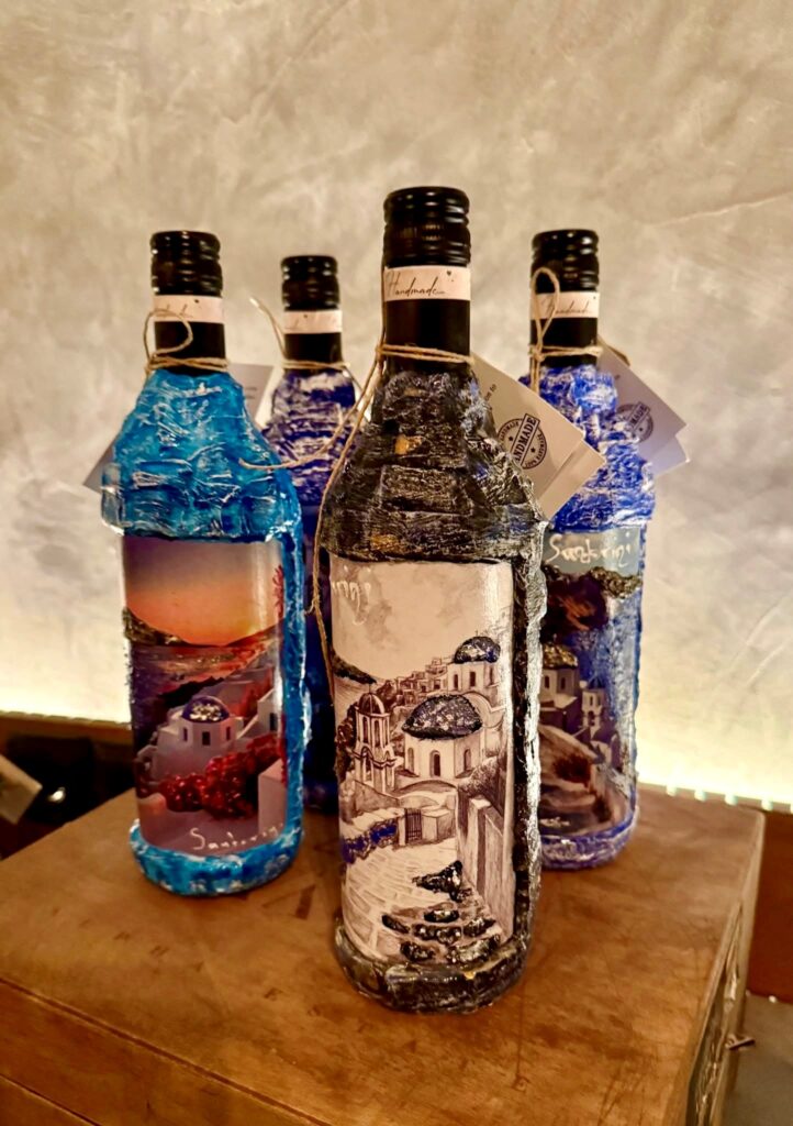 Between the aromas of freshly baked bread and the flavors of farm-to-table recipes, your eyes may be drawn to something unexpected: elegant, handcrafted wine bottles by Art Different – Handmade Creations. These one-of-a-kind decorative bottles are more than artistic pieces; they embody creativity, craftsmanship, and the spirit of uniqueness that defines both Santorini and Rizes.