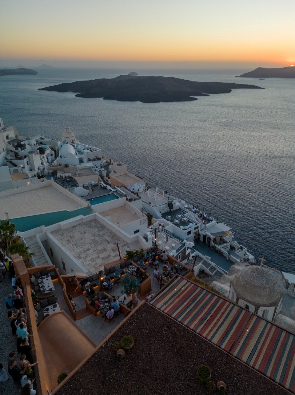 Θα ήταν παράλειψη να μην αναφέρουμε πού συμβαίνουν όλα αυτά. Οι Ρίζες βρίσκονται στη Φηρά της Σαντορίνης, και το σκηνικό είναι, με την πιο αληθινή έννοια της λέξης, εξαιρετικό. Η Καλντέρα απλώνεται μπροστά σου. Το ηφαίστειο κάθεται ήσυχα στον ορίζοντα. Το Αιγαίο πιάνει το τελευταίο φως της ημέρας σε χρώματα που φωτογράφοι αφιερώνουν μια ζωή να αποτυπώσουν και ποτέ δεν τα καταφέρνουν απόλυτα.